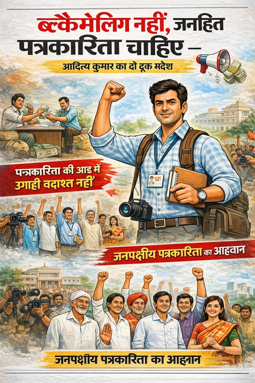 आदित्य कुमार ने यह भी साफ शब्दों में कहा कि पत्रकारिता की आड़ में ब्लैकमेलिंग, धमकी और अवैध वसूली करने वालों का हर स्तर पर विरोध किया जाएगा। ऐसे कृत्य न केवल कानून के खिलाफ हैं, बल्कि पत्रकारिता की आत्मा के भी विरुद्ध हैं। उन्होंने कहा कि यदि समय रहते ऐसे तत्वों पर लगाम नहीं लगाई गई, तो इसका खामियाजा पूरे पेशे को भुगतना पड़ेगा।