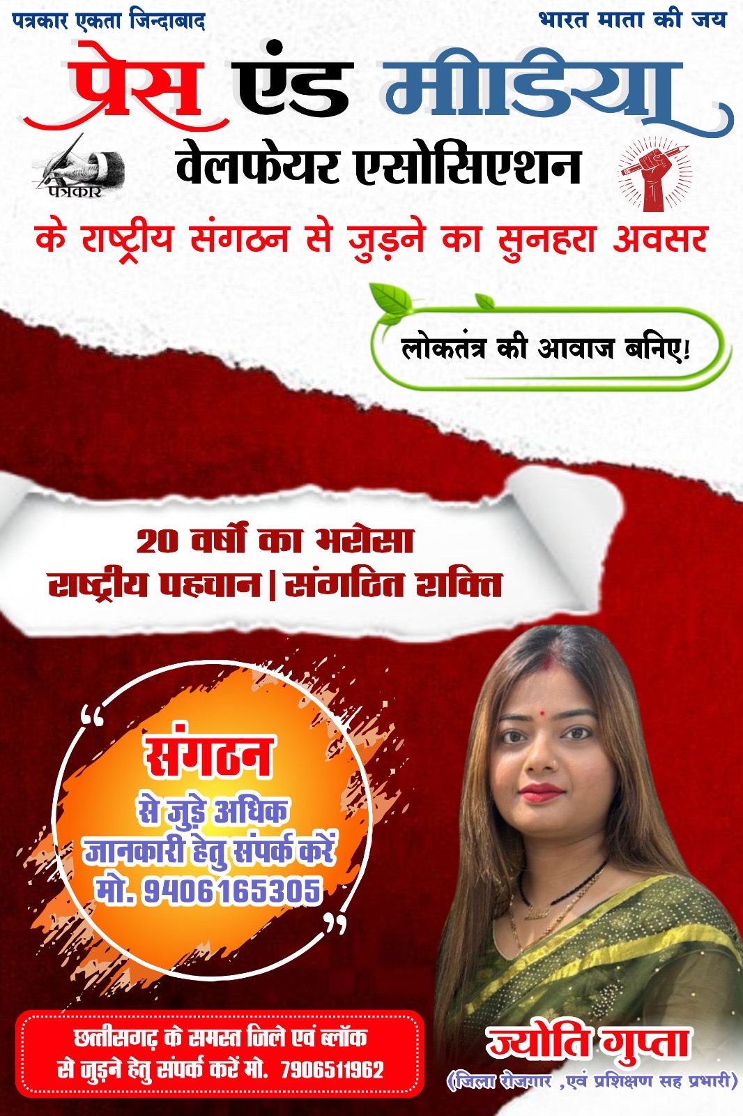 अंबिकापुर महिला सशक्तिकरण एवं कौशल विकास की दिशा में एक महत्वपूर्ण कदम उठाते हुए प्रेस एंड मीडिया वेलफेयर एसोसिएशन ने अपनीActivist टीम की सक्रिय सदस्य एवं सिया मेकओवर एंड एकेडमी (सिया ब्यूटी पार्लर) की डायरेक्टर को रोजगार एवं प्रशिक्षणजिला सह प्रभारीनियुक्त किया है। इस नियुक्ति पर संगठन एवं शुभचिंतकों में हर्ष का माहौल है।